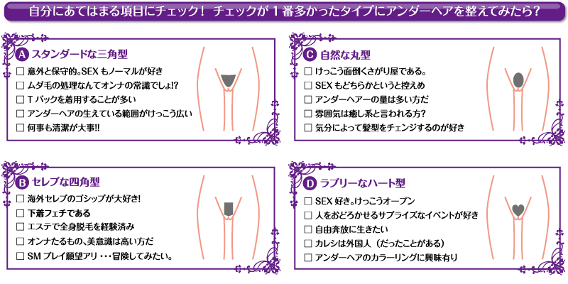 欧米諸国ではティーンのころからアンダーヘアの処理は当たり前。アンダーヘア専門のサロンもあり、バレンタインシーズンには、アソコの毛をハートにシェイプし、赤く染めるというオーダーも! さすがにそこまでは・・・という女子や、カットして剃って形を整えるって言うけど、そもそも人のアンダーヘアなんかまじまじと見たことないからわからない! という女子に、アンダーセレブから、ポピュラーなデザインを教えます!