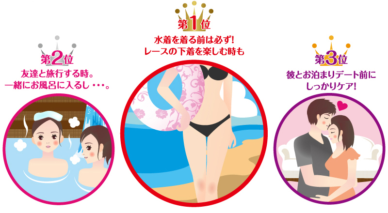やっぱり堂々の1位は水着の前のお手入れ!せっかく可愛いビキニで決めたのに、アソコの毛がはみ出して台無しにしたくないですね。せっかくのレースの下着も、レースから毛がはみ出すなんてもってのほか! 夏になるとホットパンツなど、肌を露出する機会も増えるからケアする人も多いけど、やっぱり1年中ケアする事が大切!